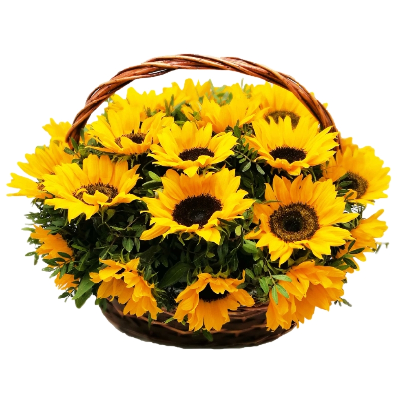 Букет состоит из 25 подсолнухов, зелень, корзина, оазис.