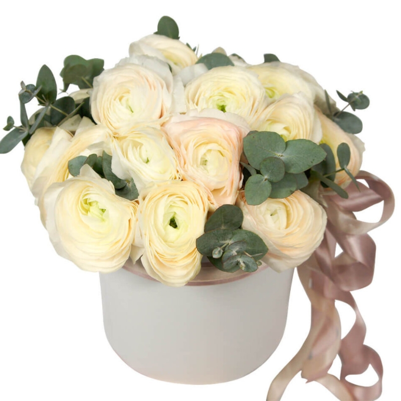 Букет состоит из 19 ранункулюсов, эвкалипт, коробка, оазис, атласная лента.