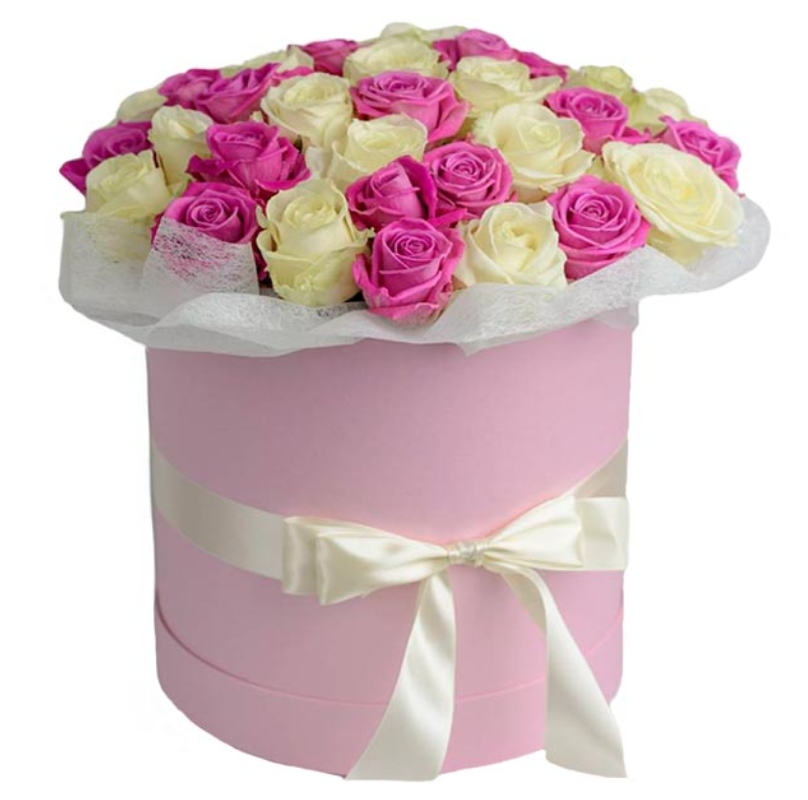Букет состоит из 26 белых роз, 25 розовых роз, коробка, атласная лента.