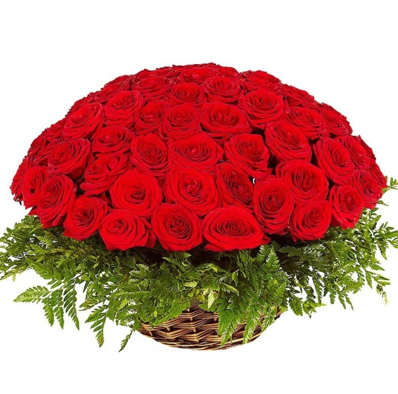 Корзина из 101 красной розы с зеленью